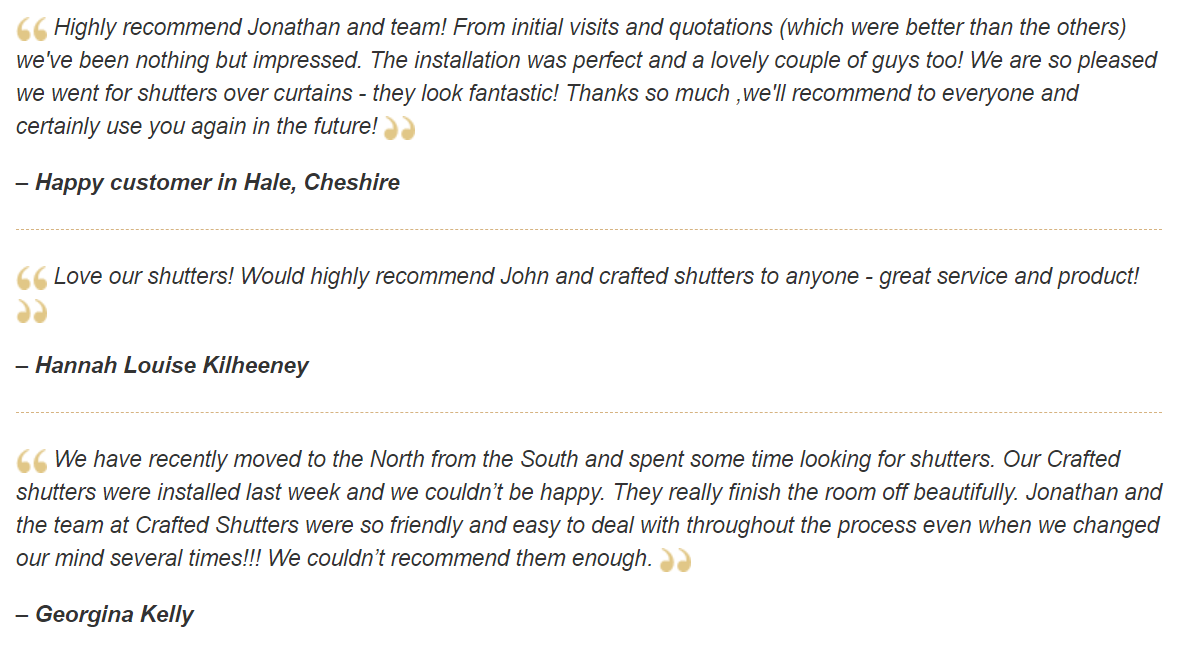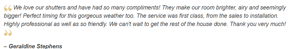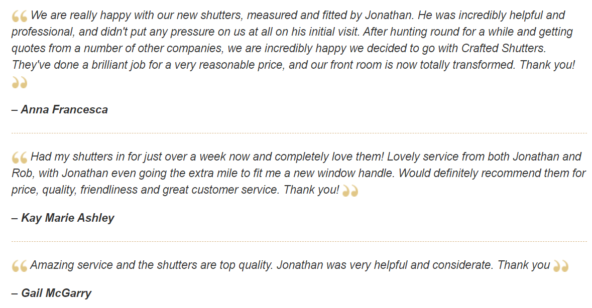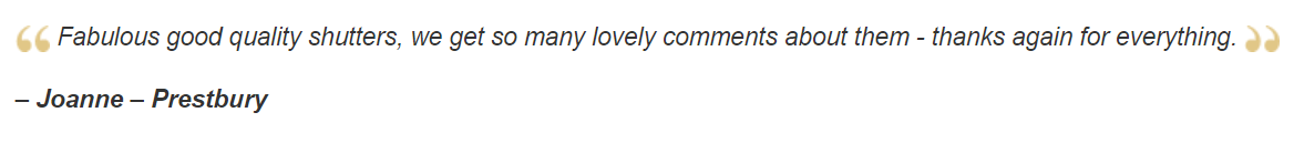 "Had my shutters in for just over a week now and completely love them! Lovely service from both Jonathan and Rob, with Jonathan even going the extra mile to fit me a new window handle. Would definitely recommend them for price, quality, friendliness and great customer service. Thank you!" -Kay Marie AshleyÂ